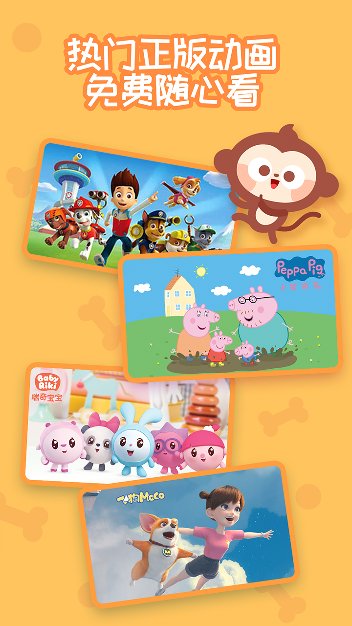 还收录了海量宝宝喜爱的热门正版动画片:小猪佩奇、汪汪队、喜羊羊与灰太狼、倒霉熊、超级飞侠、舒克和贝塔、可可小爱、海底小纵队、瑞奇宝宝、太友和萌鸡小队……等等,超多小朋友喜爱的动画明星都在这里聚集,可爱萌趣的卡通形象陪宝宝一起度过快乐的童年!