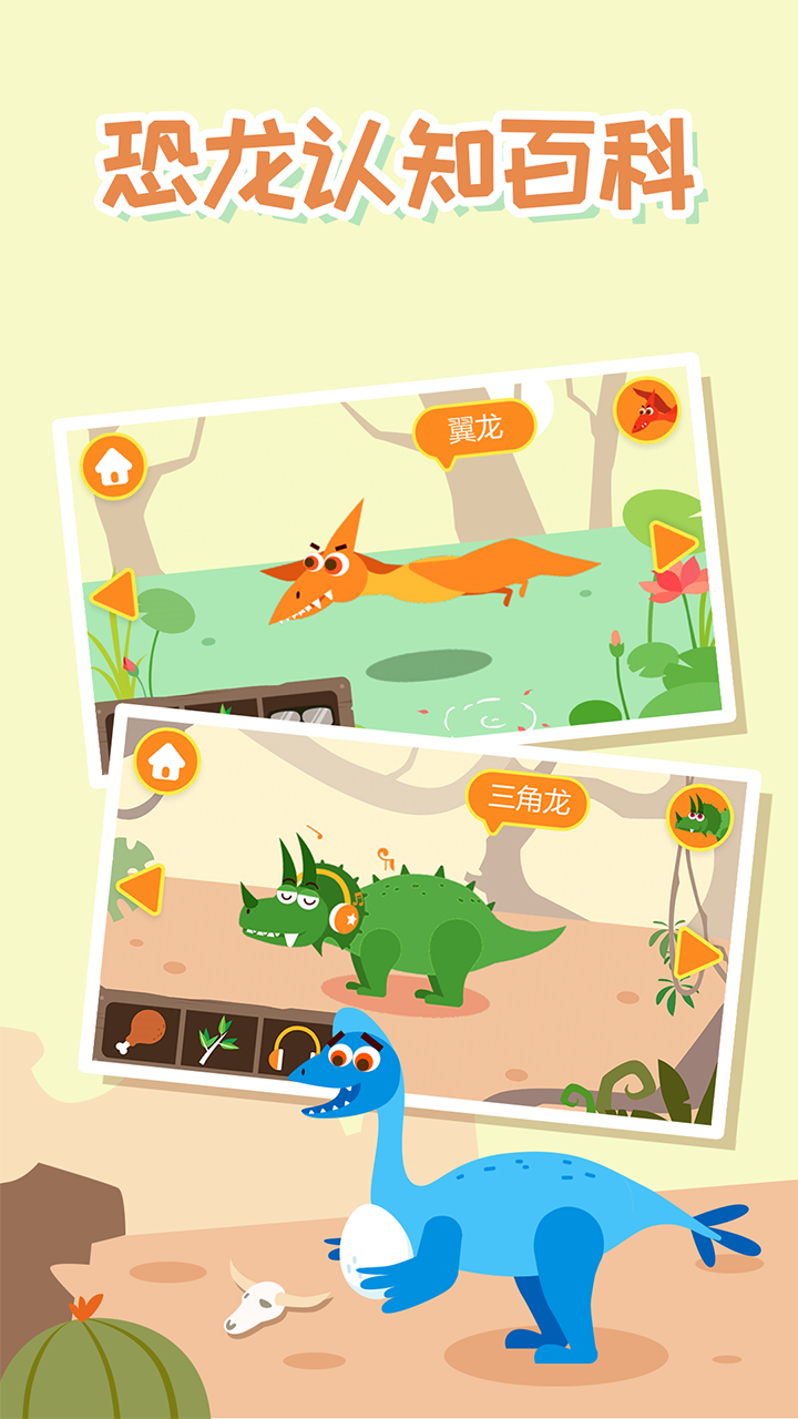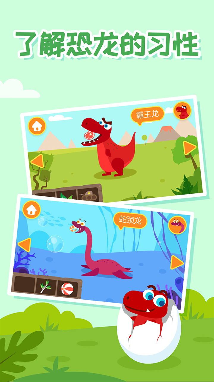 【恐龙习性】精心描绘的恐龙生活环境,生动有趣的卡通配音,使宝宝印象更深刻。恐龙喂食、时尚装扮、游戏道具,还可以与恐龙互动哦!专为宝贝量身定制,打造适合小朋友的恐龙认知大百科!