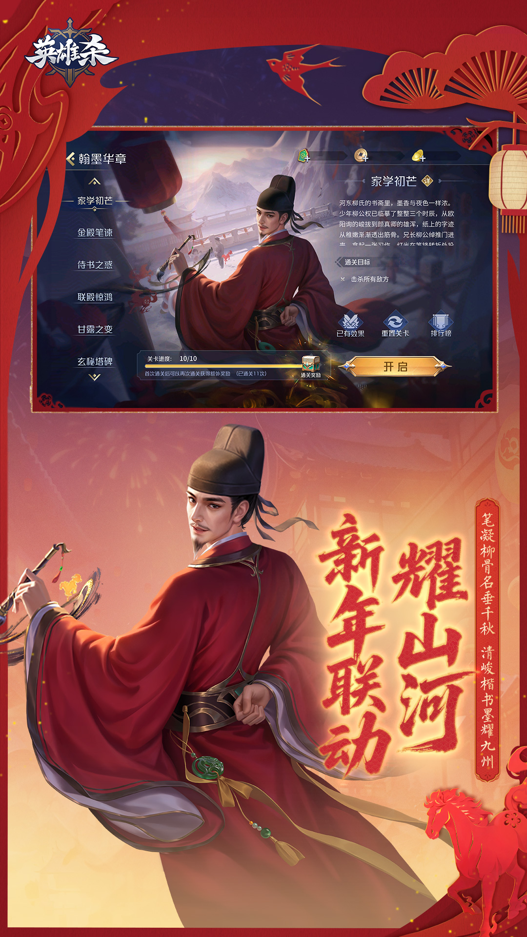 英雄杀与柳公权故里「陕西耀州」再携手,推出联动副本「翰墨华章」,将书法大家柳公权的生平故事与“心正则笔正”的风骨融入卡牌对局与剧情体验,感悟文人的风骨气韵。