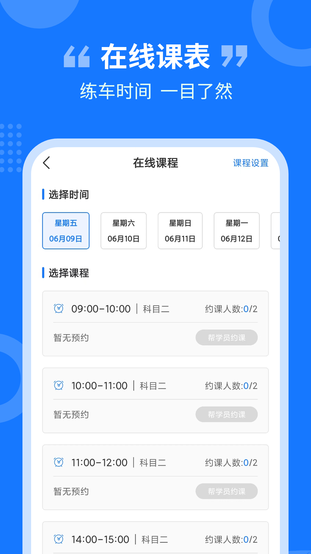 1、在线约课:教练一键发布练车课程,学员们一键预约。这样双方可灵活安排驾驶训练的时间,让教练和学员之间的协作更加高效。