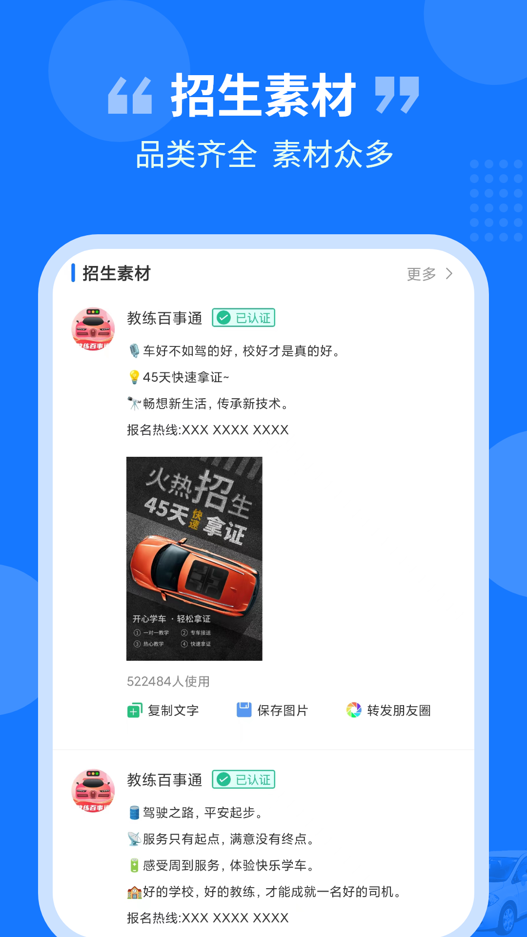 5、招生素材:有现成的文案模板、图片模板,可以让教练们轻松发圈,一站式为教练们服务。