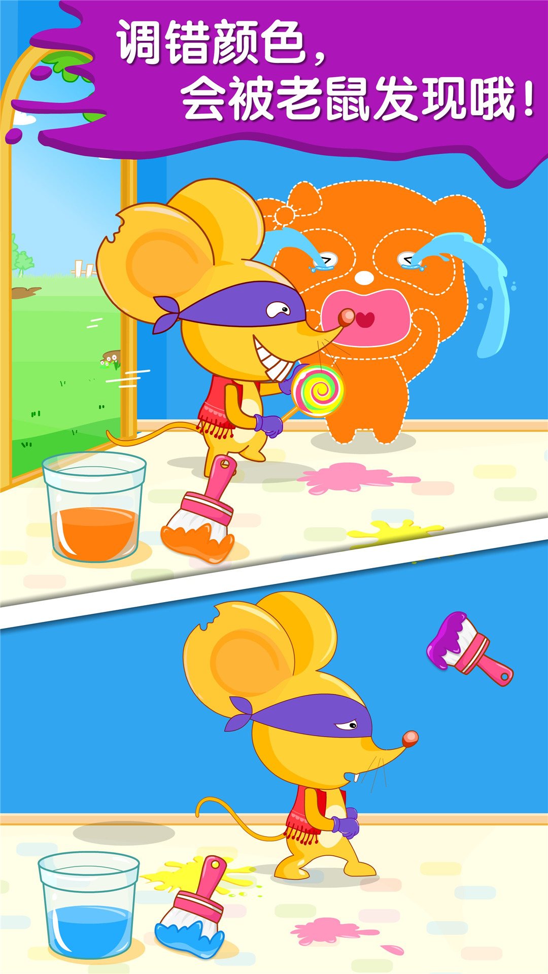 贪吃的老鼠要抢走妙妙的棒棒糖啦,宝宝们快混合不同的颜色,帮助妙妙躲过老鼠!