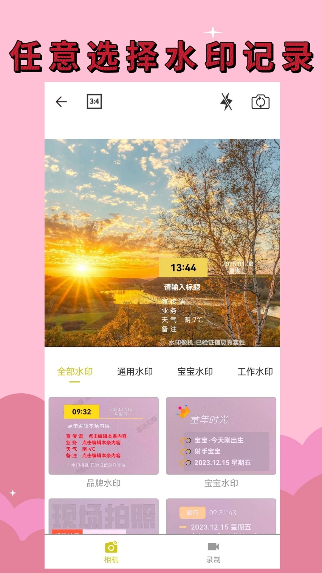 水印像机是一款记录和打卡日常生活的拍照相机。水印定位打卡相机,专业的水印打卡拍照、图片添加水印的拍照软件。多种水印模板,满足考勤打卡、现场拍照、工作记录等需求,是众多工作者的优先选择。