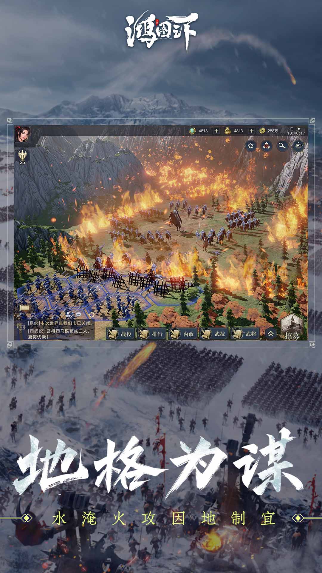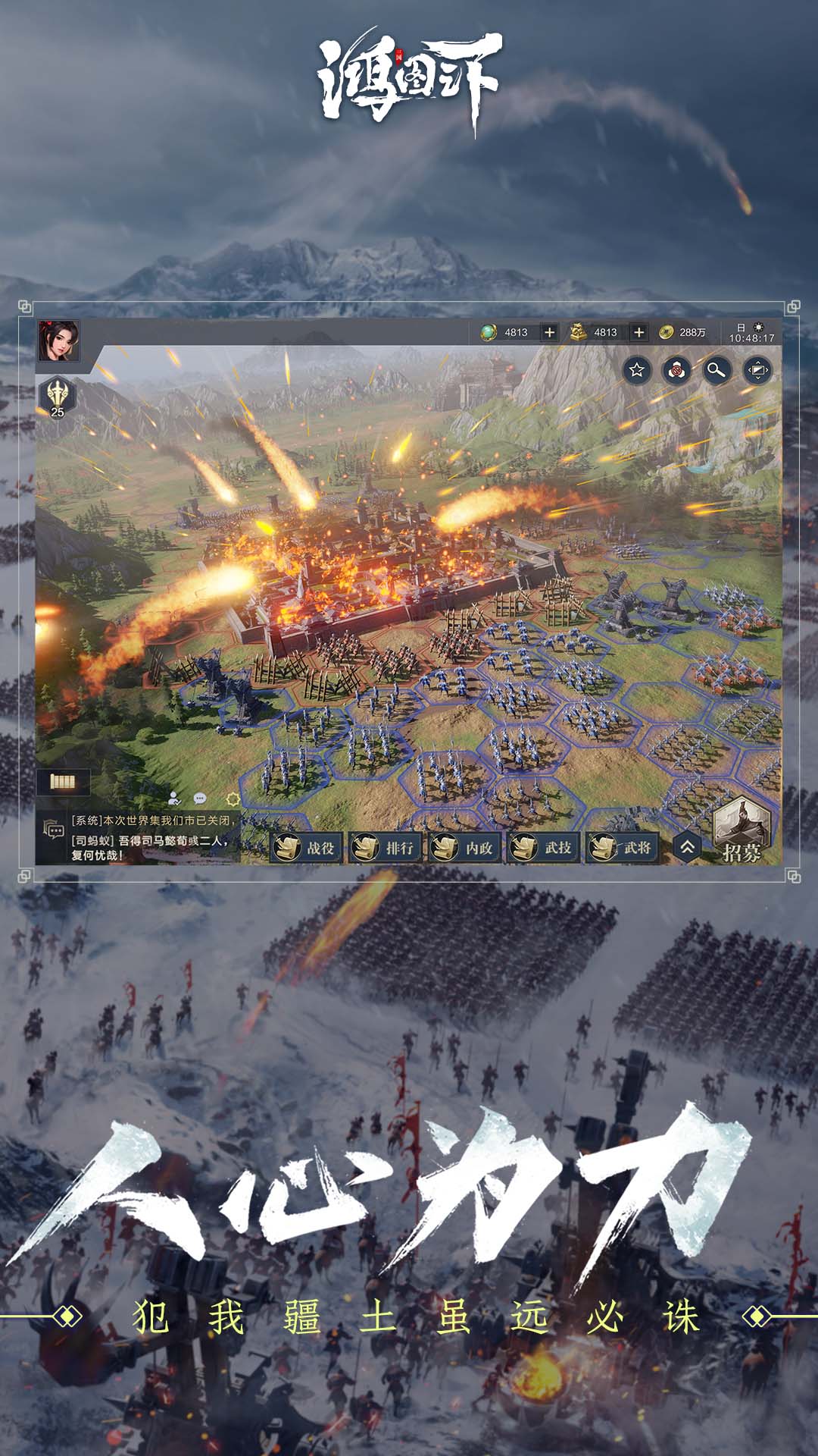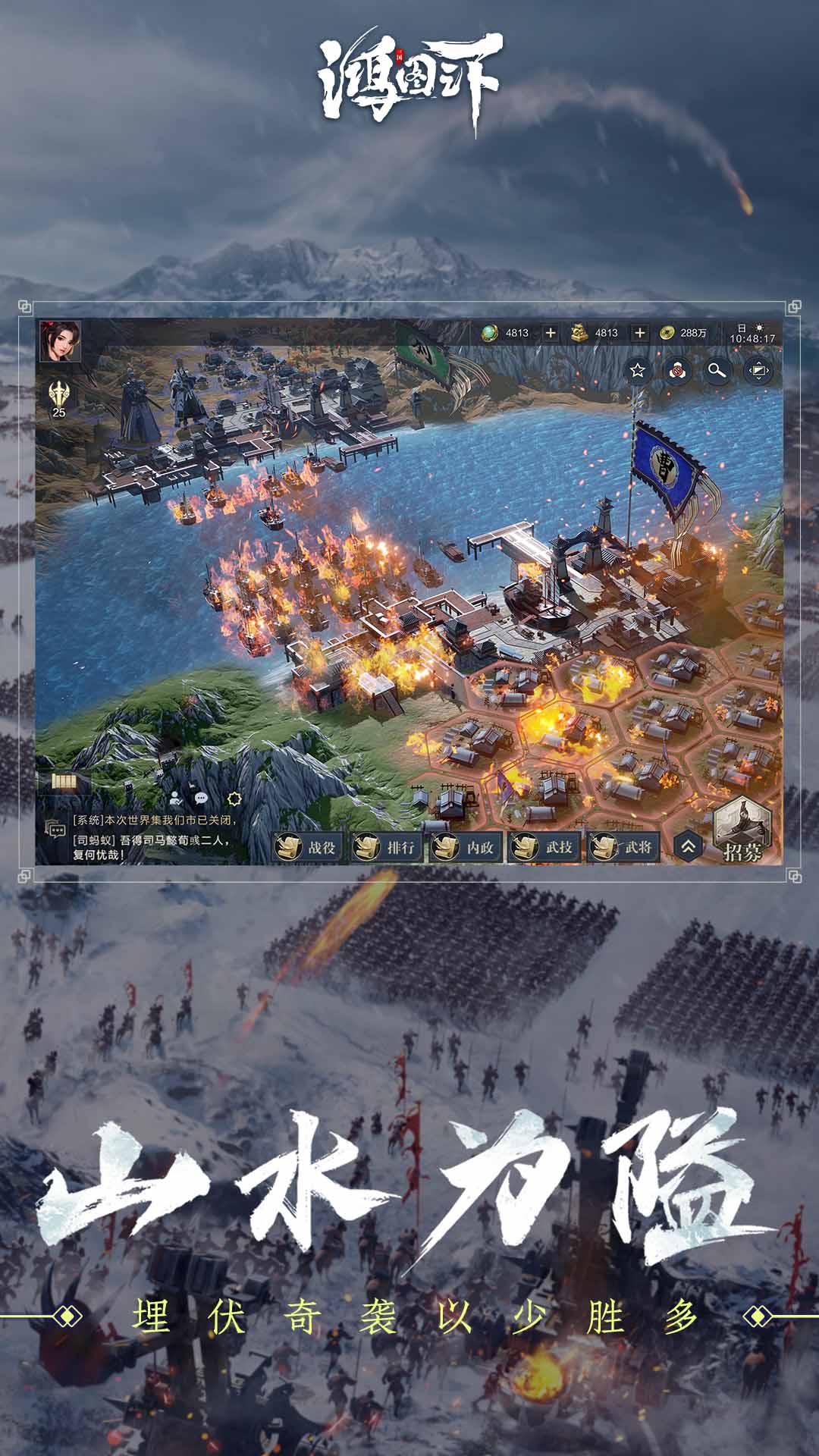 《鸿图之下》是由祖龙游戏研发,腾讯代理的旗舰级三国沙盘战略手游,借助虚幻引擎4构建了一个400万地格、真实还原地形地貌、实时模拟现实天气、昼夜四季变换的全3D宏大三国世界。
